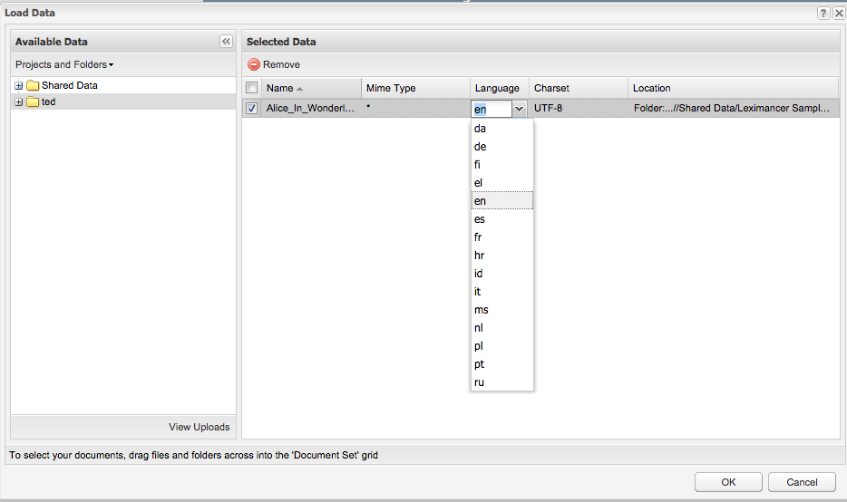 You must select the language code for each data file when you drag it into the text selection panel. If you hover the mouse over the codes in the list, you can see the full name of each language. You may need to change the Charset (character encoding) from the default utf-8. This character encoding is an attribute of your data.